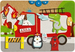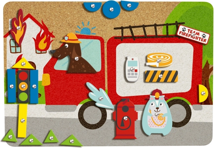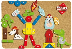 Questo gioco a martello divertente di Lena offre ore infinite di intrattenimento creativo. Con un martello, pezzi colorati e una tavola in sughero, puoi creare diversi scenari di pompieri.