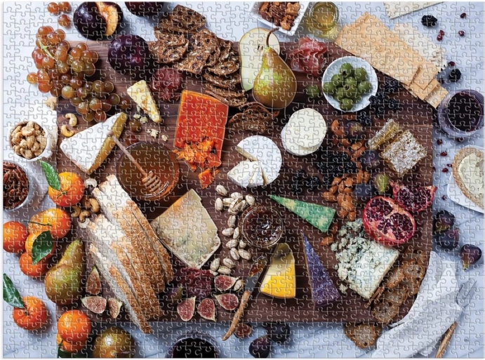 Puzzle premium da 1000 pezzi con tagliere di formaggi, finitura opaca, 5 mini puzzle, materiali FSC. Splendido regalo e relax per gli amanti del design e della gastronomia.