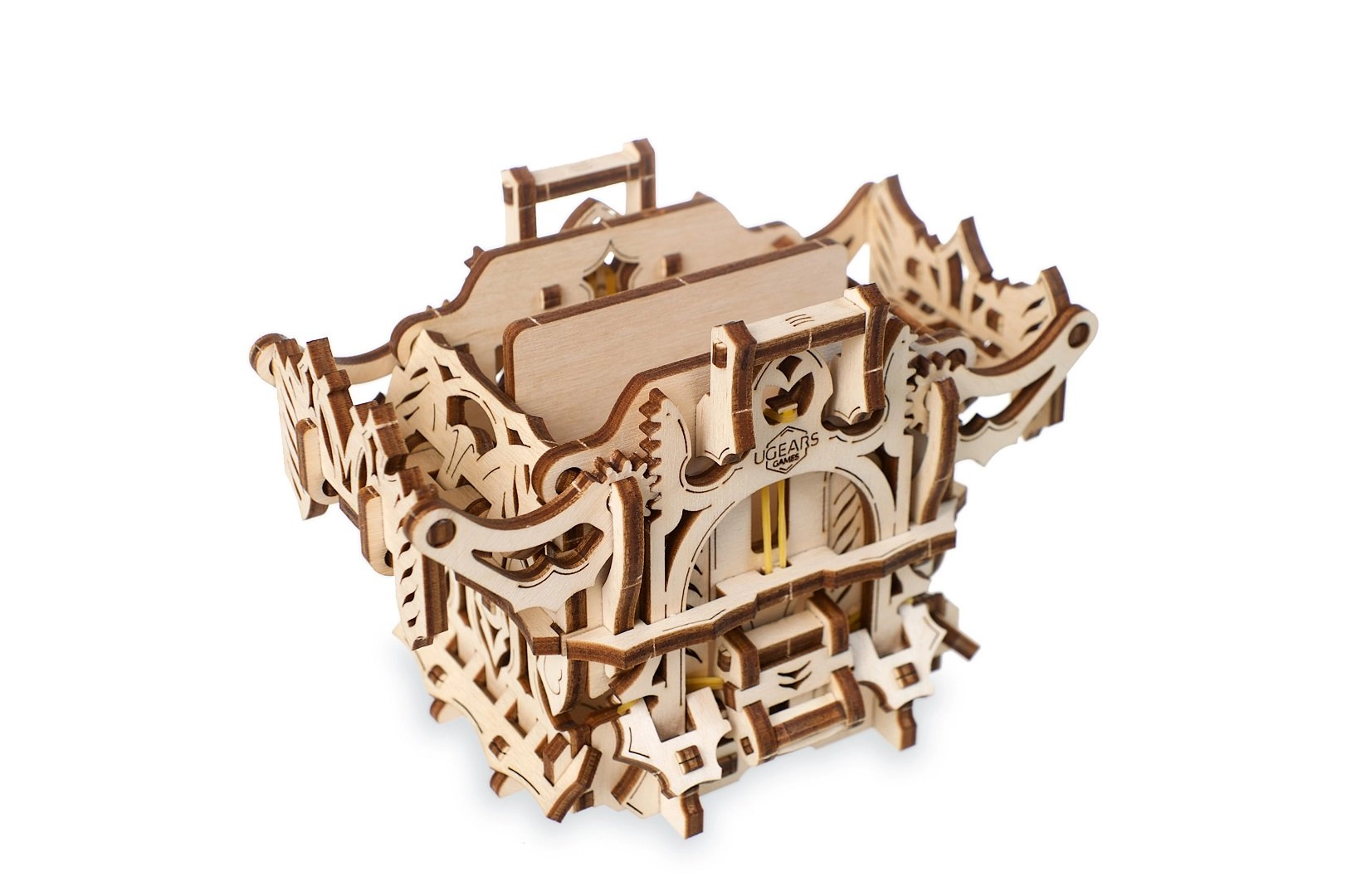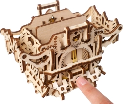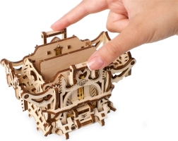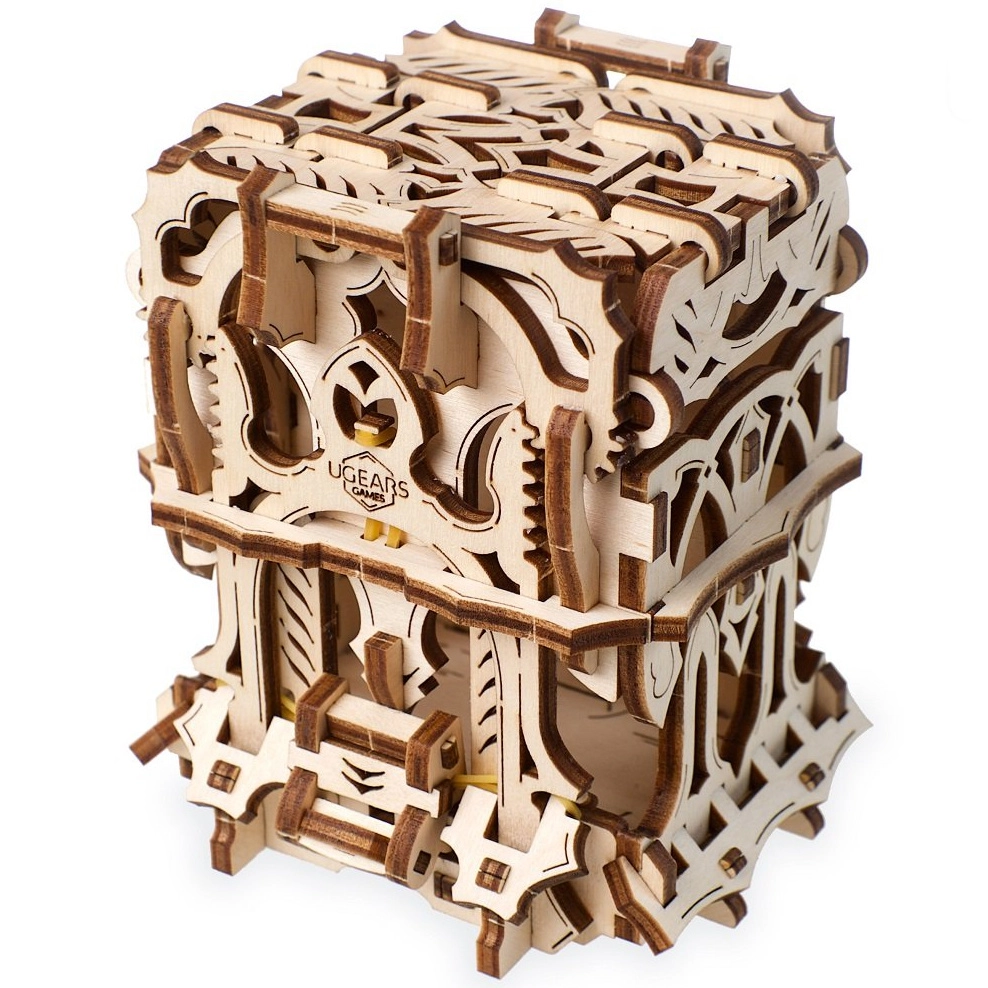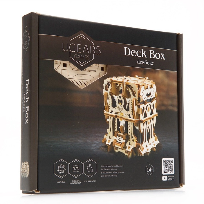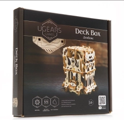 L’elegante scatola per carte in legno di UGEARS unisce un modello meccanico a un pratico contenitore per i tuoi mazzi. Include due scomparti per fino a 120 carte di dimensioni standard, si apre premendo le sporgenze superiori e si chiude con un pulsante alla base della struttura. Il modello in compensato naturale si distingue per decorazioni fantasy, si assembla facilmente senza colla e può essere eventualmente colorato con acquerelli.