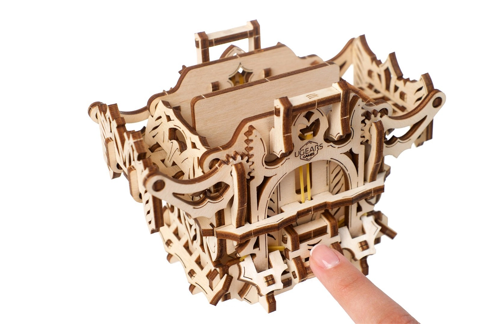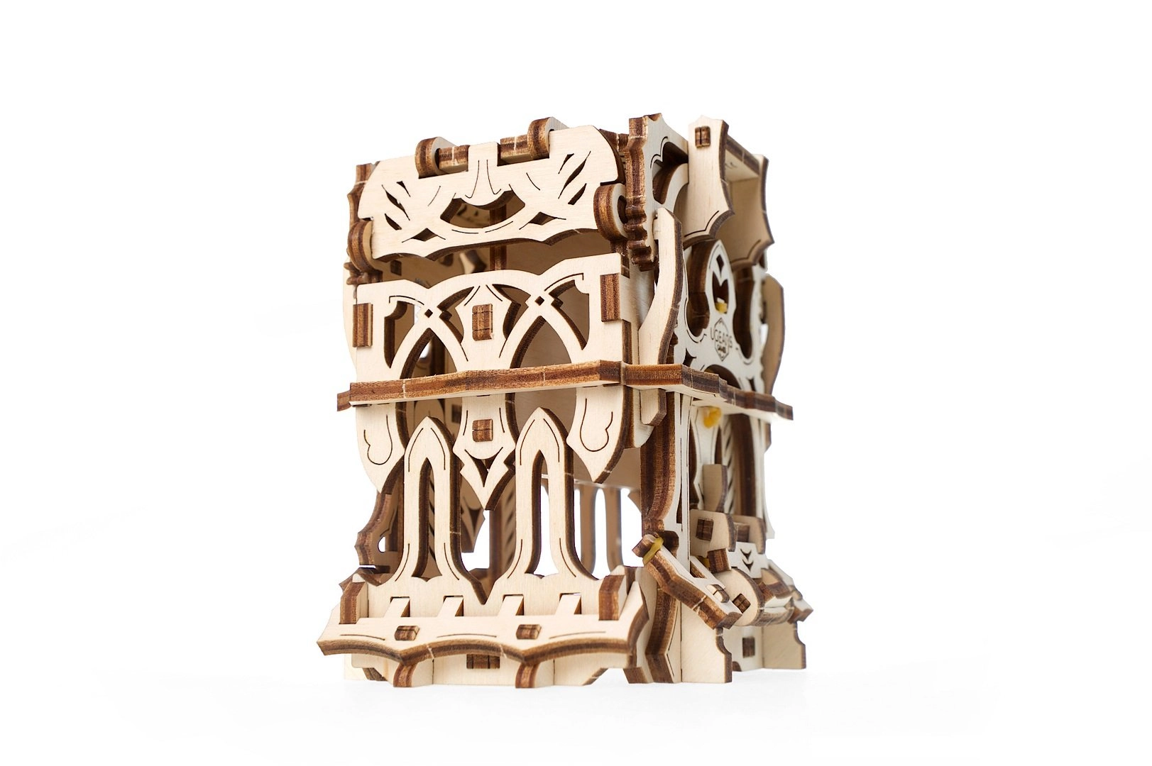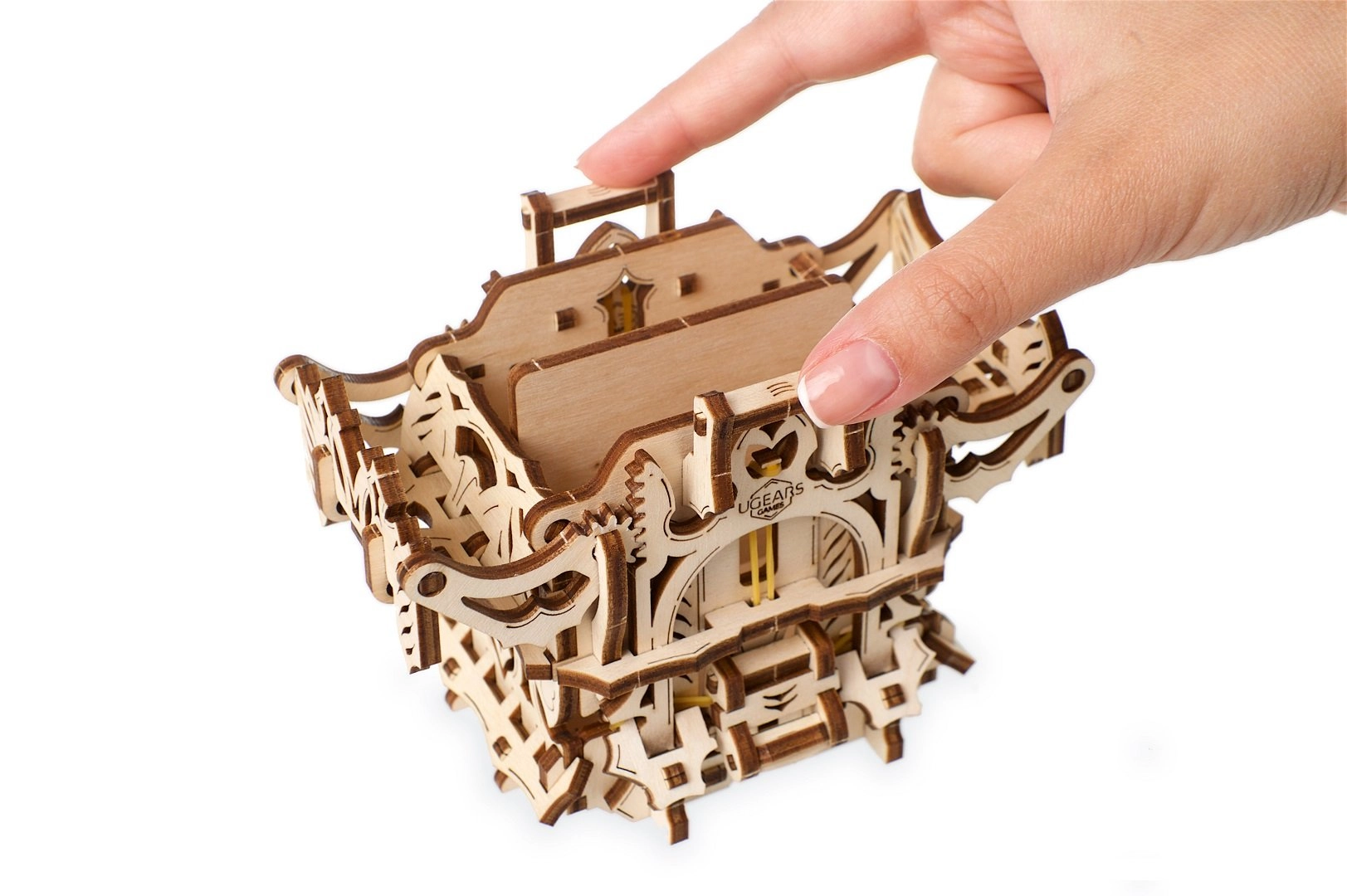 L’elegante scatola per carte in legno di UGEARS unisce un modello meccanico a un pratico contenitore per i tuoi mazzi. Include due scomparti per fino a 120 carte di dimensioni standard, si apre premendo le sporgenze superiori e si chiude con un pulsante alla base della struttura. Il modello in compensato naturale si distingue per decorazioni fantasy, si assembla facilmente senza colla e può essere eventualmente colorato con acquerelli.