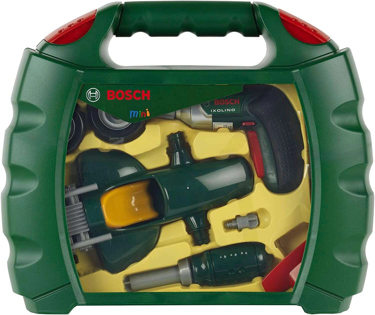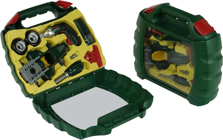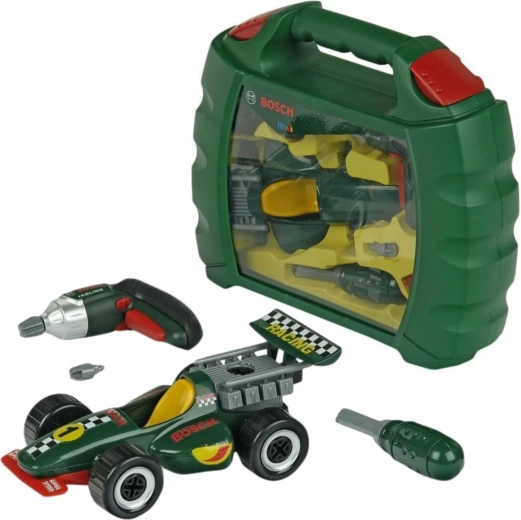 Questo set realistico con licenza BOSCH mini include l’avvitatore a batteria Ixolino con bit rotante ed effetto sonoro, un cacciavite, viti e tutti i pezzi necessari per costruire l’auto da corsa verde scuro. Il tutto è riposto ordinatamente in una robusta valigetta di plastica con coperchio trasparente e manico comodo, così il gioco può accompagnarvi ovunque.