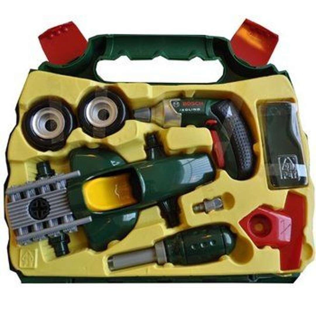 - Valigetta con organizer, avvitatore a batteria per bambini BOSCH Ixolino, cacciavite manuale, telaio e carrozzeria dell’auto, 4 ruote, 2 spoiler (rosso e verde), 6 viti, adesivi