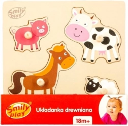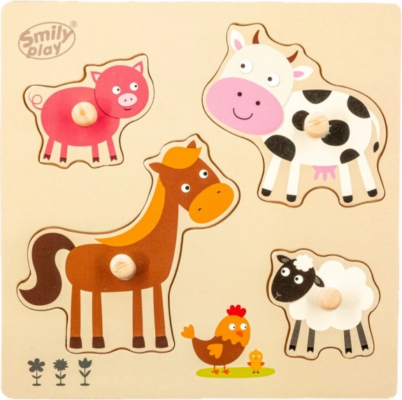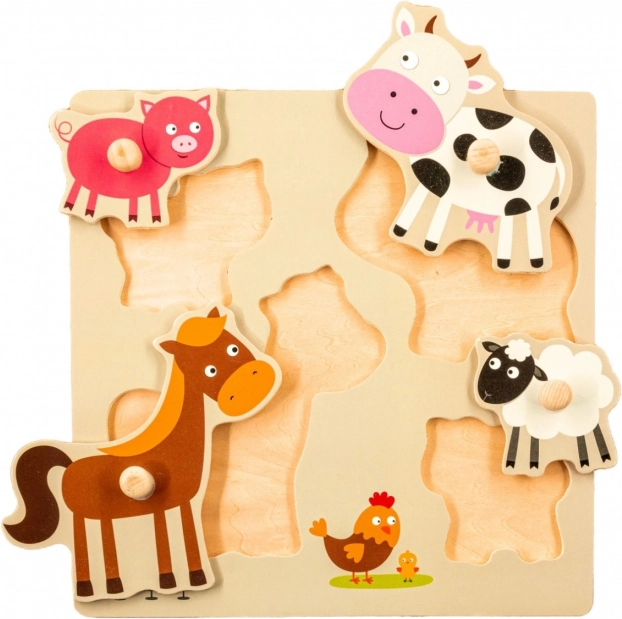 Puzzle di legno con spazi appositamente sagomati sulla tavola, offre quattro forme e colori diversi che rappresentano animali domestici. Ogni pezzo ha una maniglia che facilita l'assemblaggio al bambino.