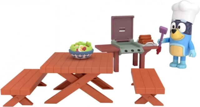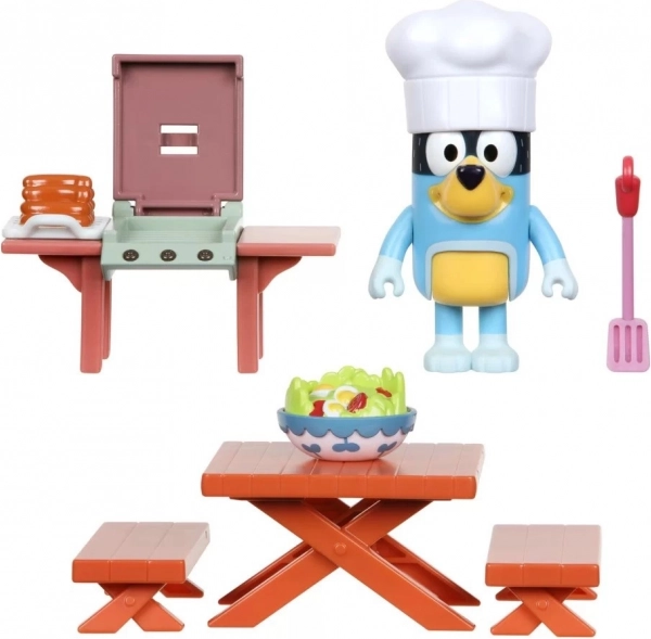 Mini set completo con la figurina di Bluey con cappello da chef, barbecue e tavolo da picnic. Ideale per rivivere i momenti preferiti di BLUEY.