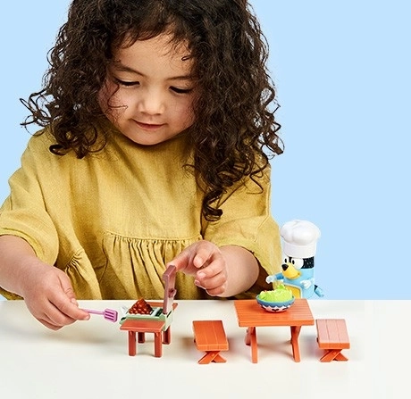 Il mini set Bluey Grigliata in giardino porta in cameretta l’atmosfera di una festa in famiglia all’aperto. La figurina con cappello da chef, il barbecue con accessori e il tavolo da picnic con panche incoraggiano i bambini a raccontare storie e a giocare insieme.
