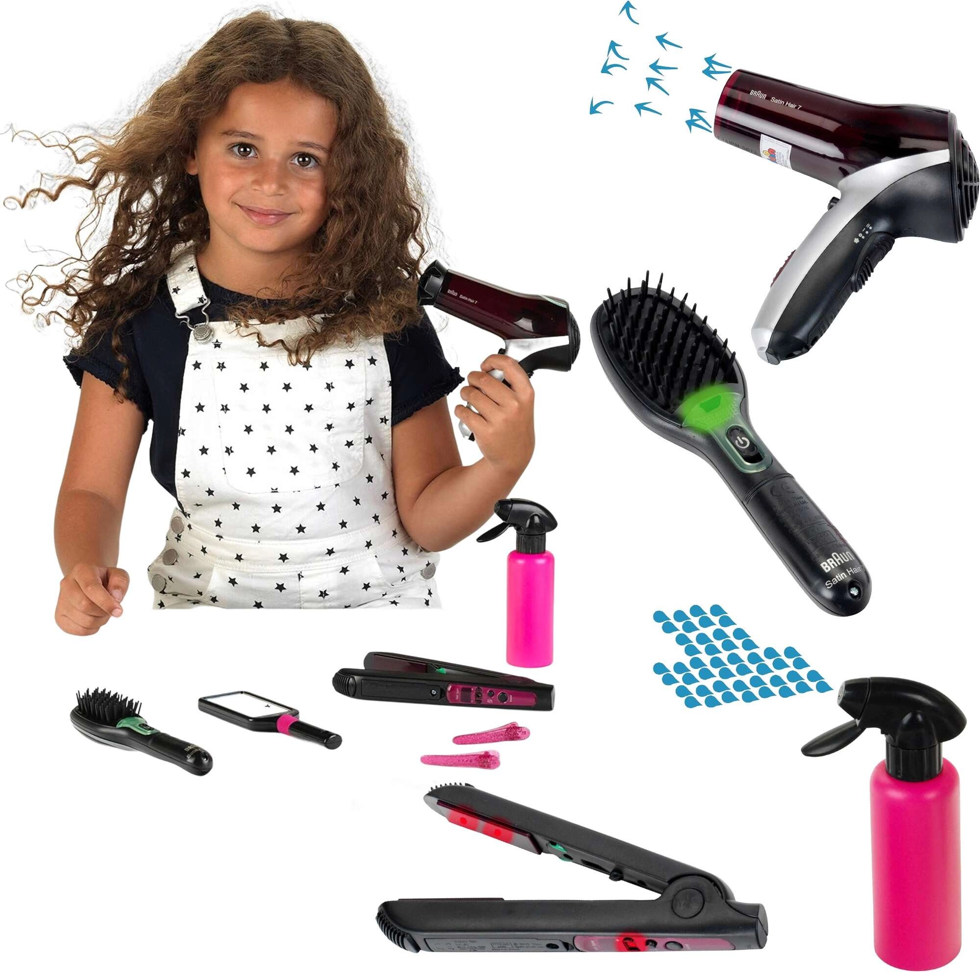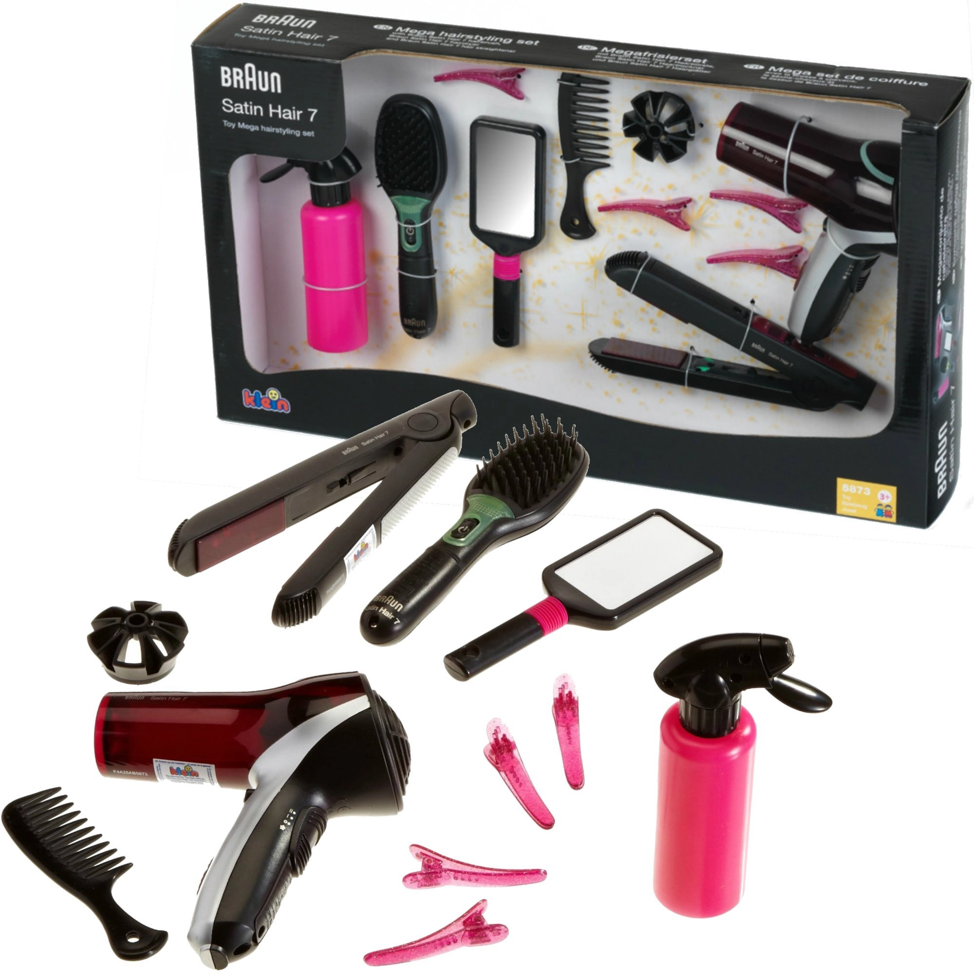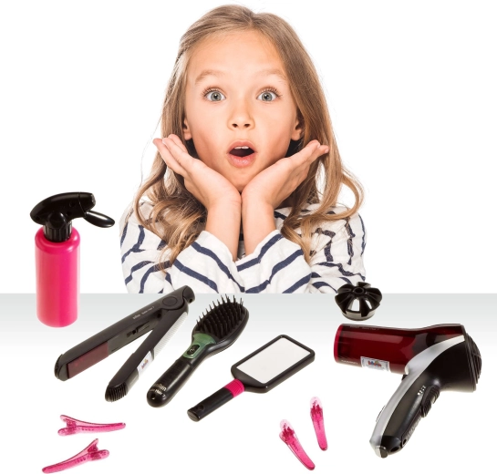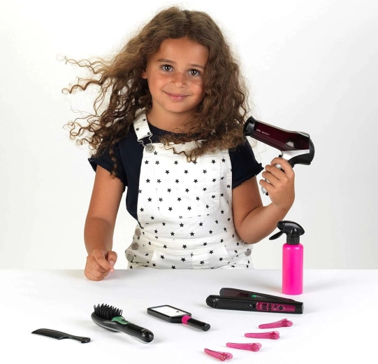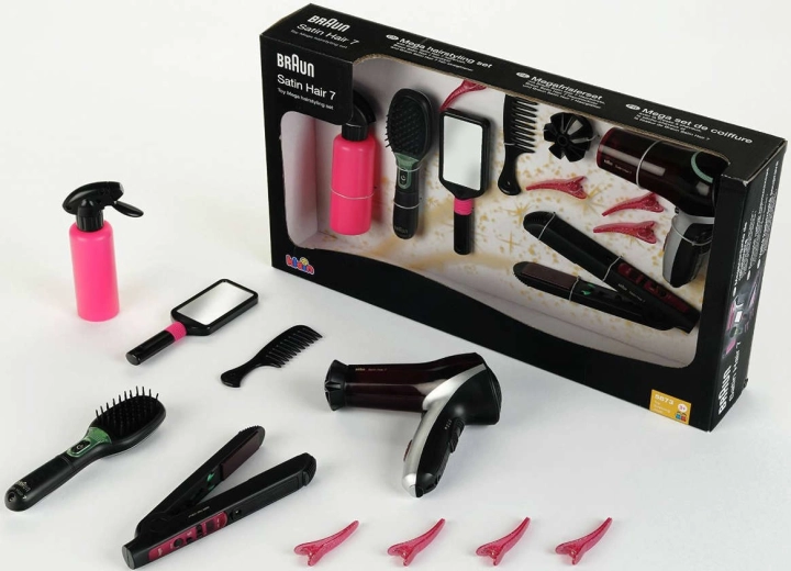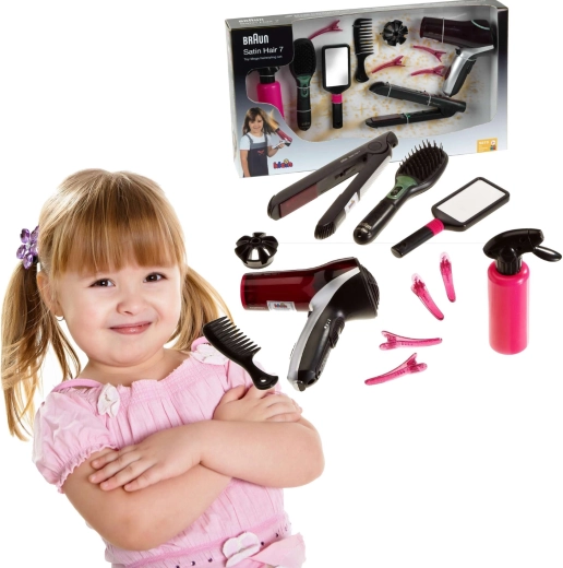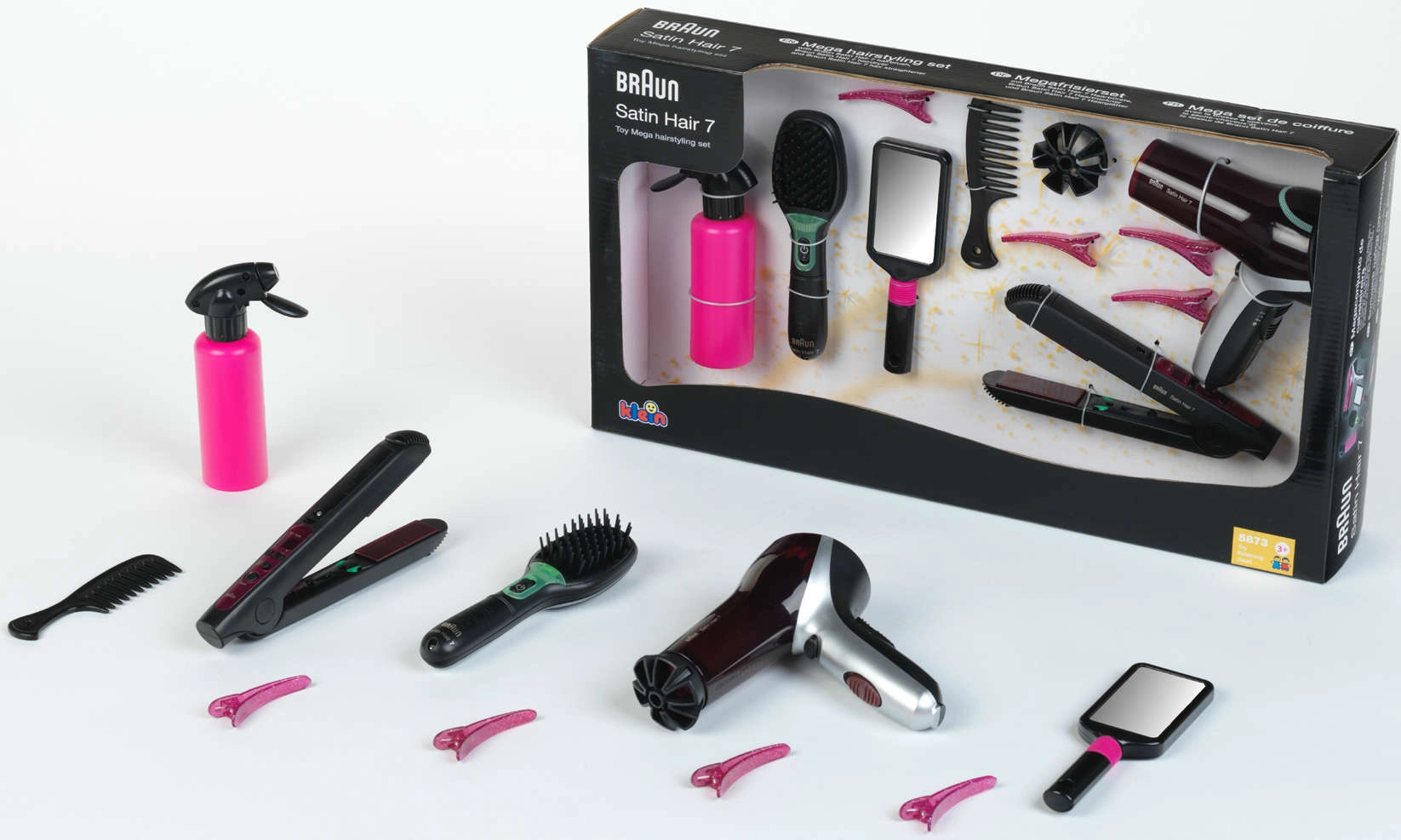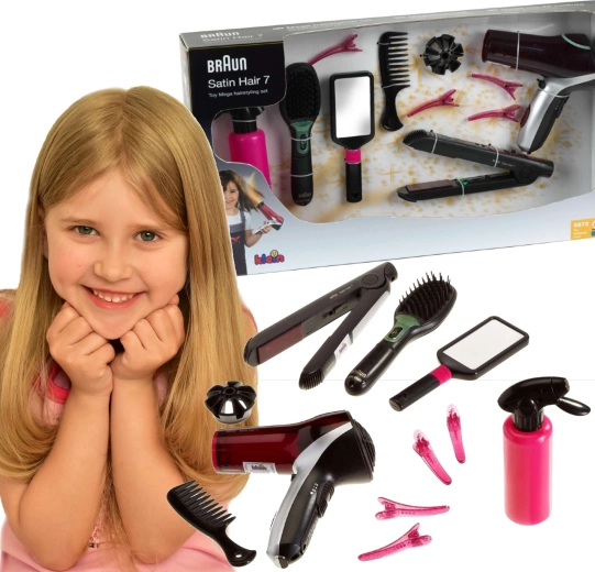 Il grande set da parrucchiere ispirato alla linea BRAUN Satin Hair offre ai bambini tutto il necessario per acconciature alla moda. I giocattoli sono progettati con attenzione alla sicurezza e imitano gli strumenti reali: phon, piastra e spazzola funzionano a batteria e creano realistici effetti luminosi e sonori, pur non producendo calore né getto d’aria.