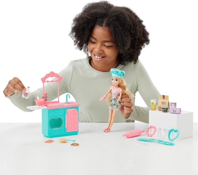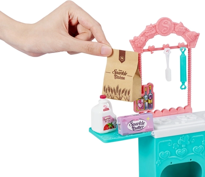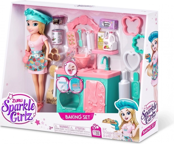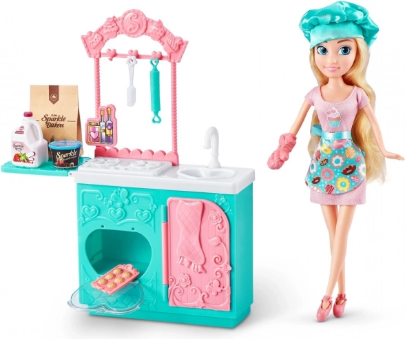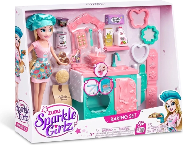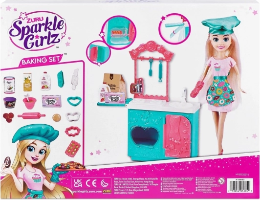 Il set include elementi essenziali per il gioco, comprese piccole riproduzioni alimentari, ciotole, spatole e stampi, per imitare realisticamente la cottura. Apri il forno, inserisci i biscotti e fai finta che si stiano cuocendo! Grazie agli abiti intercambiabili, la bambola può essere combinata con altre figure della collezione Sparkle Girlz.