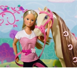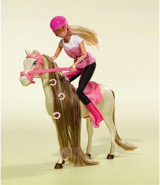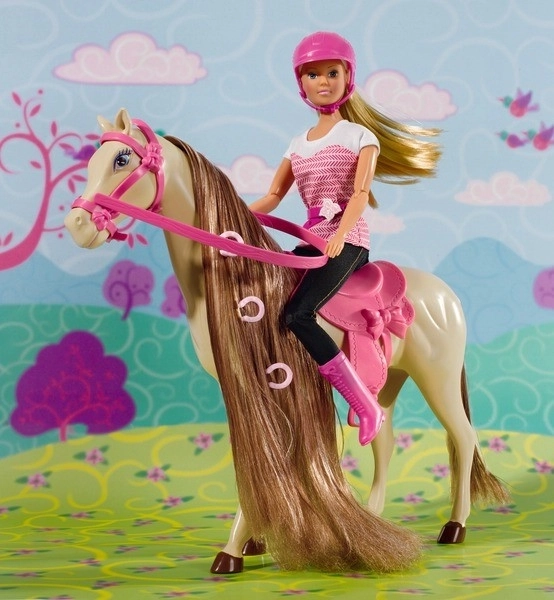 Steffi con il suo cavallo in abbigliamento da fantina. Il cavallo ha una criniera molto lunga che si può pettinare e acconciare.