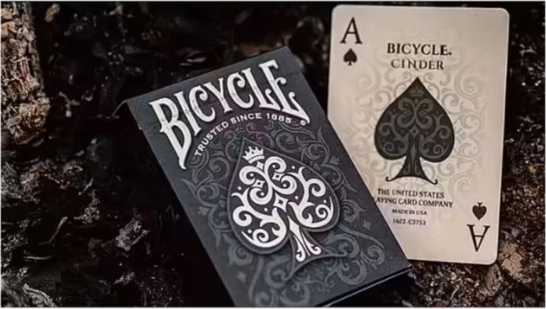 Carte da gioco di lusso Bicycle Cinder con design cenere, lamina argentata e goffratura 3D. Figure dorate che evocano braci ardenti. Ideali per giocatori e collezionisti.