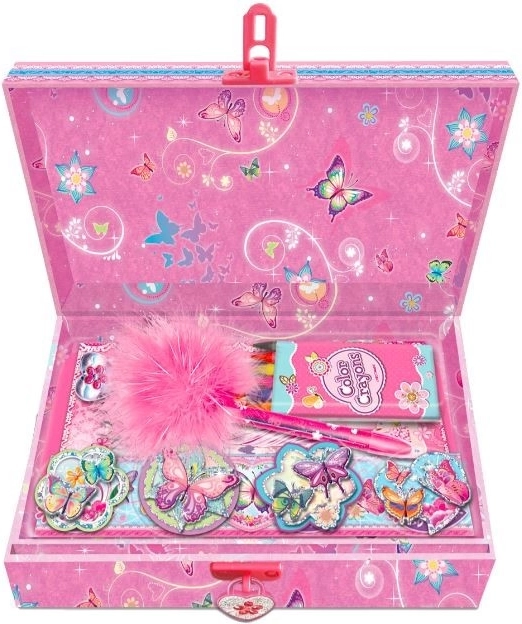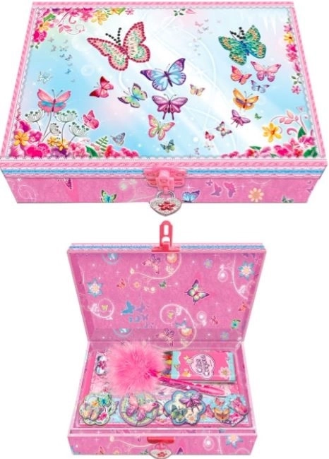 Set con diario Pecoware con motivo farfalle è confezionato in una scatola decorativa e si chiude con un piccolo lucchetto, ideale per mantenere al sicuro i vostri segreti.