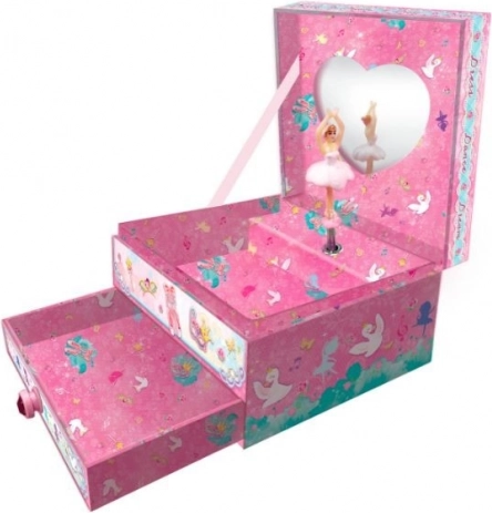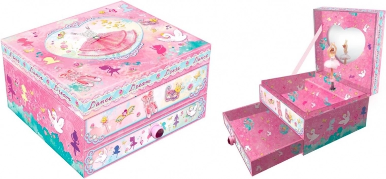 Elegante scatola musicale portagioie con figurina rotante e melodia classica, perfetta per piccole e grandi amanti dei tesori. All’apertura la figurina inizia a muoversi; all’interno troverai uno specchietto, spazio per piccoli oggetti e un cassetto estraibile. La scatola funziona grazie a una carica meccanica senza batterie.