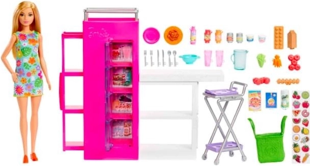Questo set contiene oltre 30 diversi accessori, tra cui uova, verdure e alimenti, che permettono la personalizzazione e il gioco creativo. Che tu stia preparando la cena o organizzando la spesa, Barbie è pronta a tutto nel suo vestito floreale con borsa della spesa.