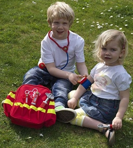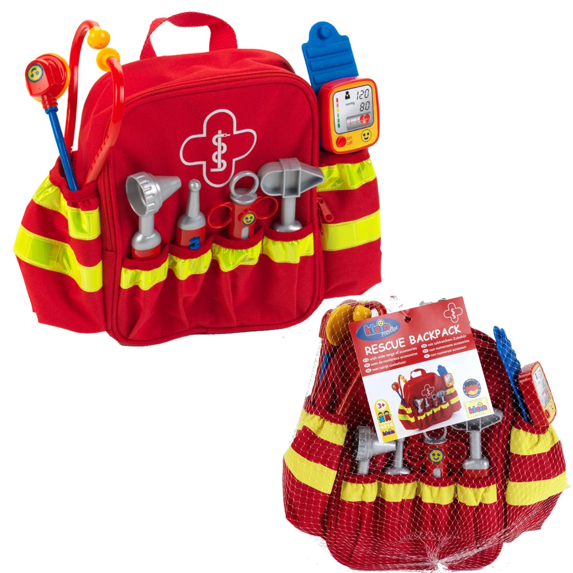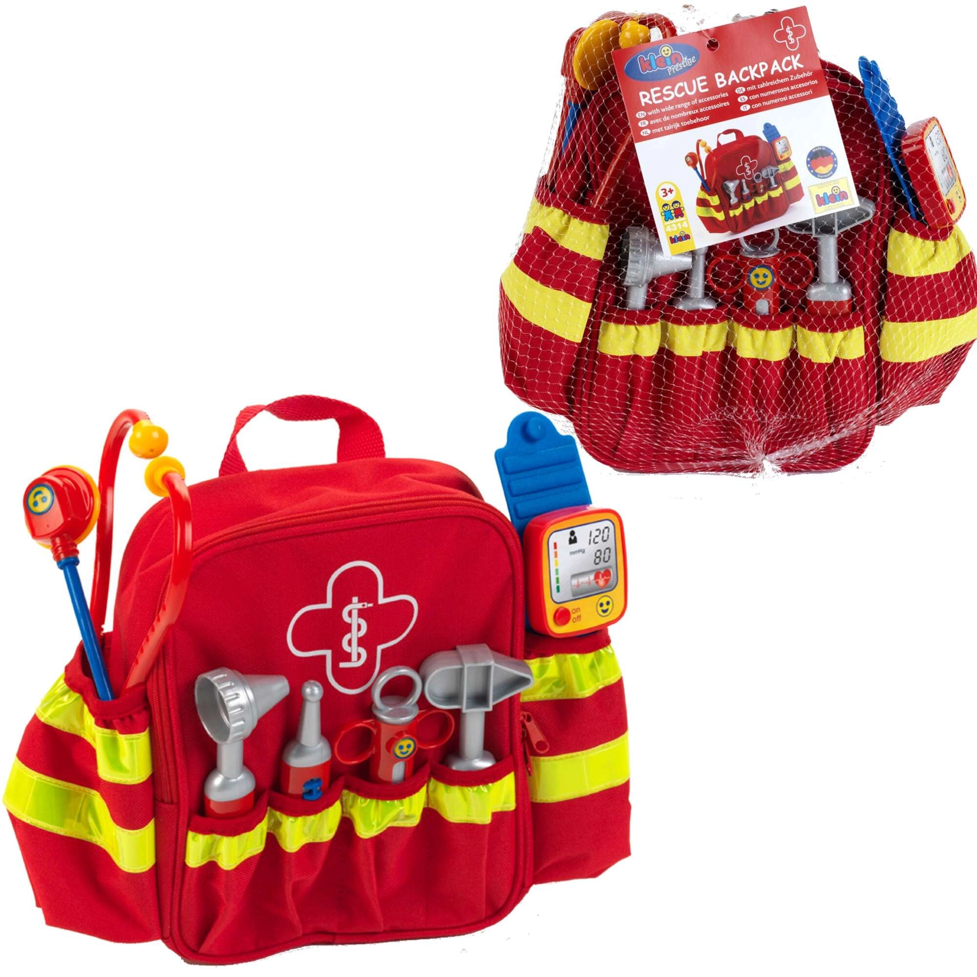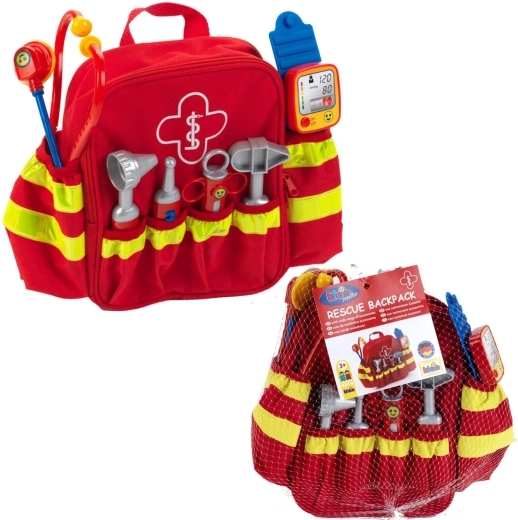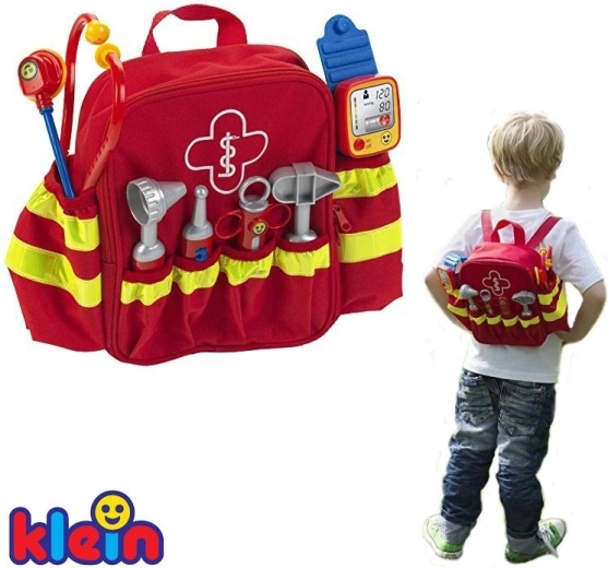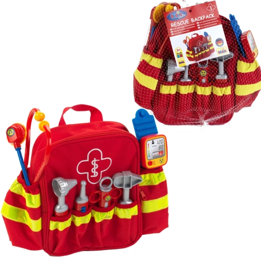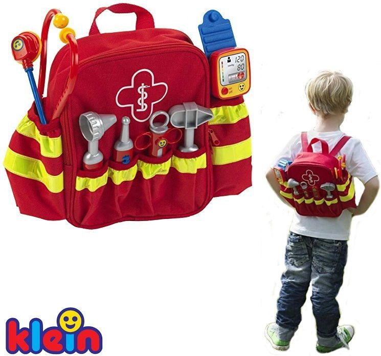 Il set comprende sei classici strumenti da “ambulatorio”: stetoscopio per ascoltare il cuoricino, otoscopio per le orecchie, termometro, martelletto per riflessi, siringa e sfigmomanometro. La lavorazione di qualità e i bordi arrotondati garantiscono un gioco sicuro per bambini dai 3 anni. Grazie agli spallacci regolabili, lo zainetto si adatta comodamente alla maggior parte dei bambini in età prescolare.
