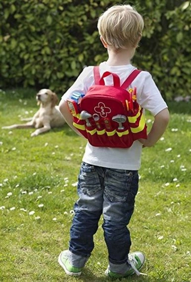 Lo zaino rosso con croce bianca e strisce gialle riflettenti è ben visibile e sicuro durante il gioco all’aperto. Le tasche pratiche tengono gli strumenti a portata di mano e la cerniera li chiude in sicurezza.