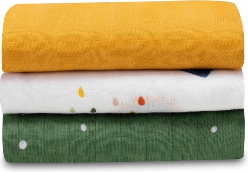 Tre pannolini di dimensioni 70 × 70 cm con motivi diversi per l'uso quotidiano – per passeggino, allattamento, cambio e come copertina leggera.