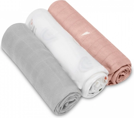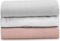 Tre mussoline coordinate nei colori, misura 70 × 70 cm, utili per fasciatura, durante l’allattamento, per la pappa e come telo di appoggio per il cambio – a casa e in viaggio.