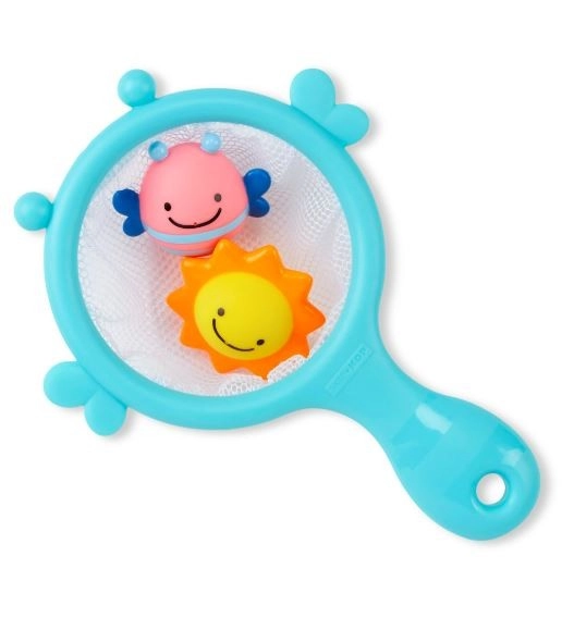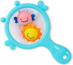 Un retino con manico solido, due secchielli e un canestro per palline trasformano il bagnetto in un gioco attivo che sviluppa la coordinazione occhio–mano.