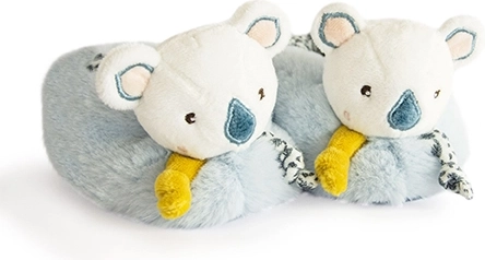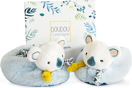 Adorabili scarpine in peluche a tema koala in una scatola regalo ideale come dono per neonati. Le scarpine con sonagli scaldano i piedini dei bambini e aggiungono un tocco di fantasia all'abbigliamento.