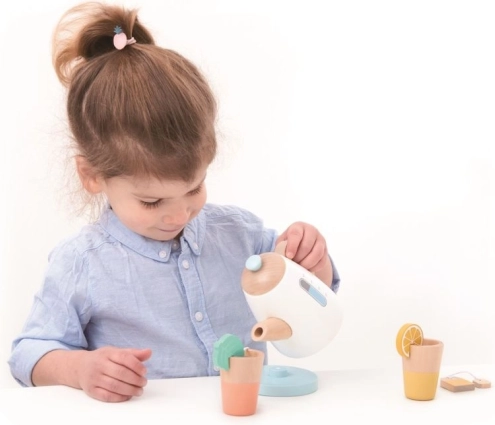 Aiuta i bambini a sviluppare le loro abilità sociali e motorie con il set da tè in legno, ideale per giochi di immaginazione. Adatto ai bambini dai 3 anni, questo set include una teiera e tazze progettate in colori naturali e pastelli per un aspetto attraente. Create i vostri tè e momenti di divertimento con amici o famiglia.