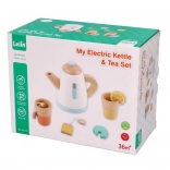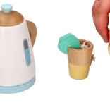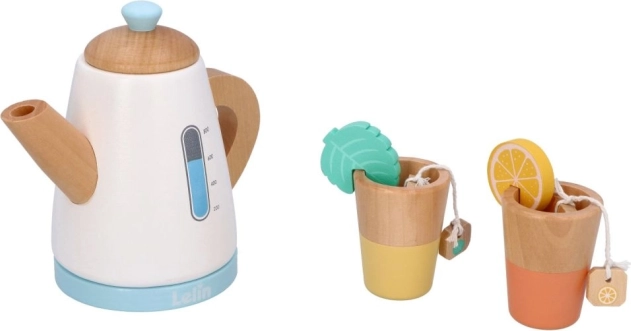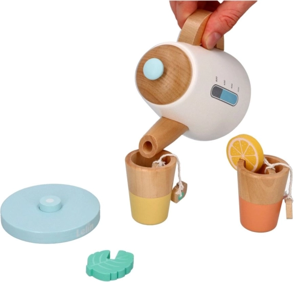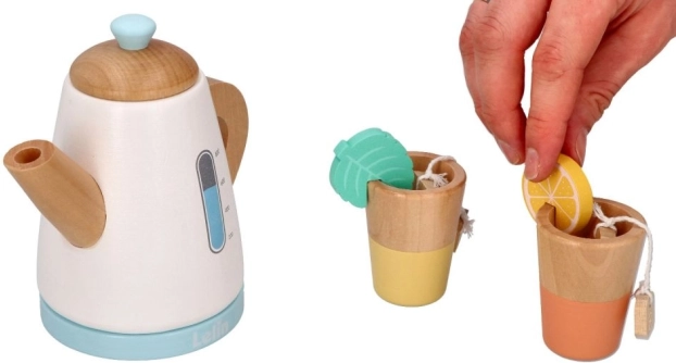 Partecipate al gioco del tè con il set da tè in legno, che include una teiera, tazze e accessori come fette di limone e bustine di tè.