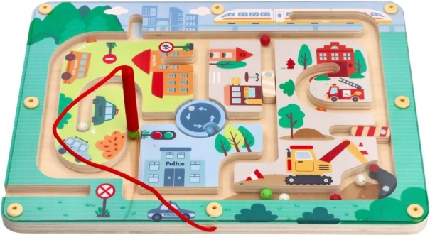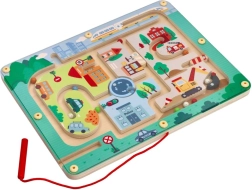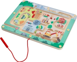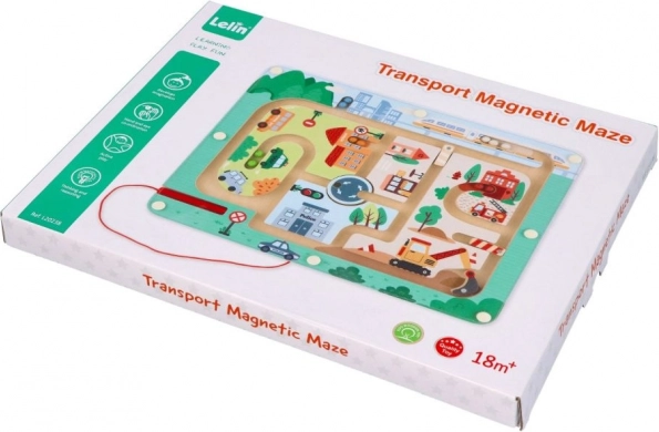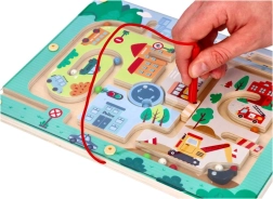 Scopri un mondo di divertimento con il Labirinto magnetico Veicoli, progettato per stimolare il pensiero e l'abilità delle piccole mani. Questo giocattolo è realizzato in legno di qualità e presenta una scena cittadina piena di strade, edifici e veicoli. Con l'aiuto di una bacchetta magnetica rossa, i bambini guidano piccole sfere lungo il percorso, promuovendo le loro abilità manuali e la coordinazione occhio-mano.