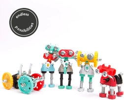 Con questo kit non è un problema creare robot, auto o invenzioni insolite. Puoi coinvolgere la fantasia e utilizzare diversi materiali riciclabili come cartone o viti.