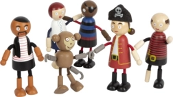Il set contiene sei figure in legno: il capitano pirata, quattro membri dell'equipaggio e una scimmia. Ideale per espandere il mondo dei pirati.