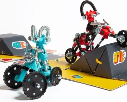 Parti per un'avventura di velocità con il set di costruzioni OffBits RaceBit! Costruisci le tue squadre di gara con dadi e bulloni e trasforma l'imballaggio a zero rifiuti in un circuito di gara.