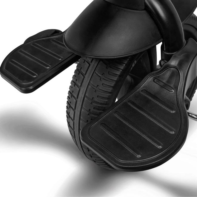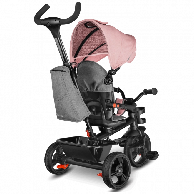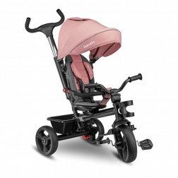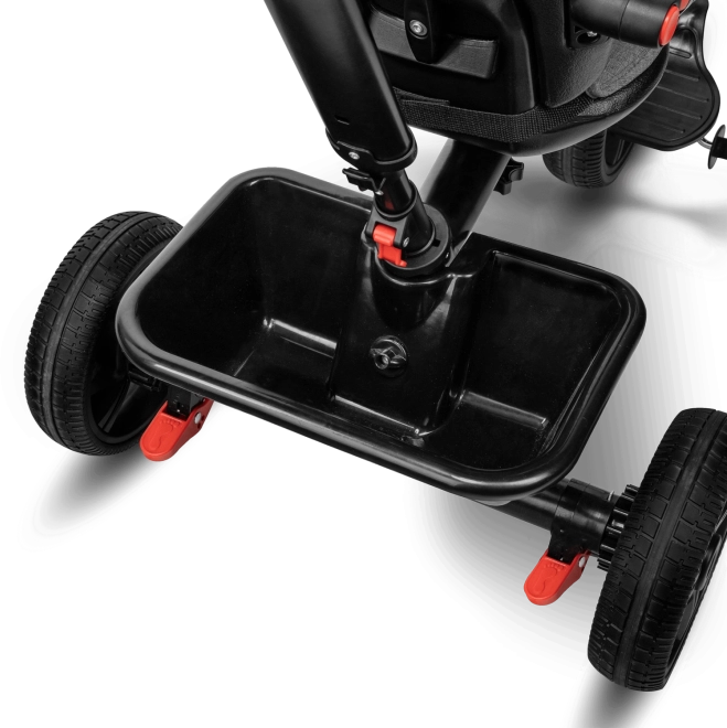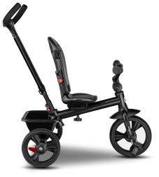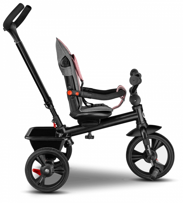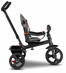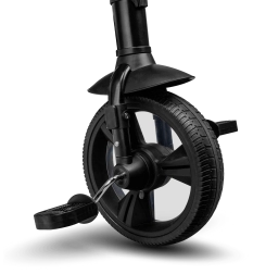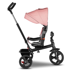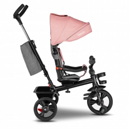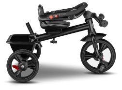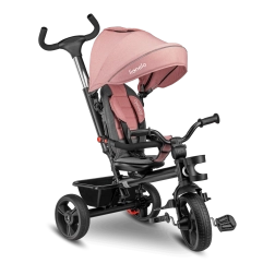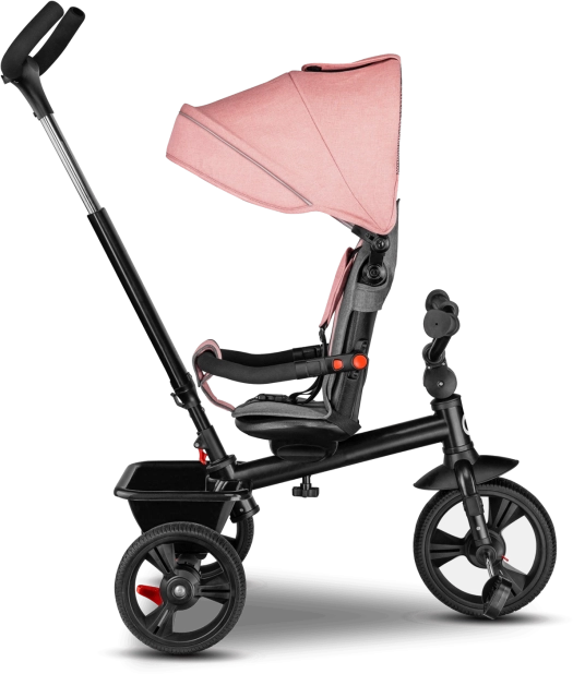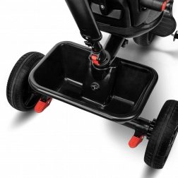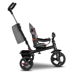 Per il massimo comfort ci sono la cappottina regolabile con finestra trasparente, il maniglione regolabile per i genitori e una dotazione pratica: cestino, borsa e portabottiglia. La sicurezza è aumentata da cinture a 3 punti, barra di protezione, elementi riflettenti e due meccanismi frenanti posteriori indipendenti. Il triciclo si richiude facilmente in dimensioni compatte e, una volta chiuso, può essere trasportato comodamente grazie alla maniglia integrata.