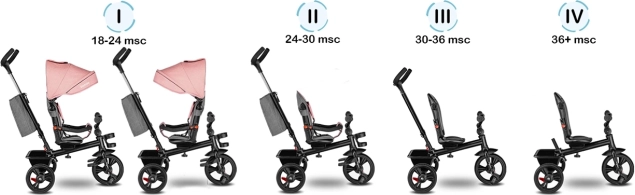 Il sedile può essere ruotato per la guida fronte strada o fronte genitore. I genitori apprezzeranno il maniglione regolabile, la cappottina con finestrella e il poggiapiedi per i più piccoli.