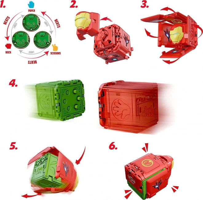 Scopri un gioco avvincente ispirato ai MARVEL Avengers, che unisce regole semplici, elementi collezionabili e azione veloce. Ogni dado nasconde la scelta sasso, forbici o carta sotto la maschera di un eroe preferito. Imposta la mossa, coprila con la maschera, lancia i dadi uno contro l’altro e rivela il vincitore – il sasso batte le forbici, le forbici battono la carta e la carta batte il sasso.
