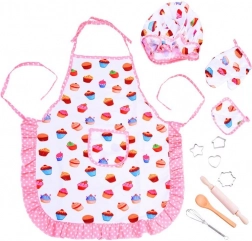 grembiule, cappello da cuoco, guanto, presina in tessuto, matterello in legno, cucchiaio di legno, frusta in metallo, 4 formine in metallo