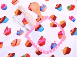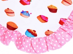 Grembiule e accessori con motivo cupcake colorato e volant rosa proteggono i vestiti e donano uno stile divertente alla cucina.