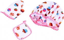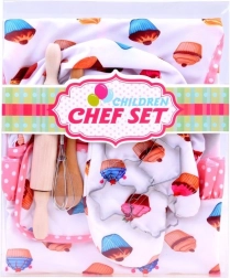 Nella confezione trovi tutto il necessario: grembiule, cappello, guanto, presina, matterello, cucchiaio di legno, frusta e 4 formine in metallo. I bambini possono iniziare subito a cuocere e creare.