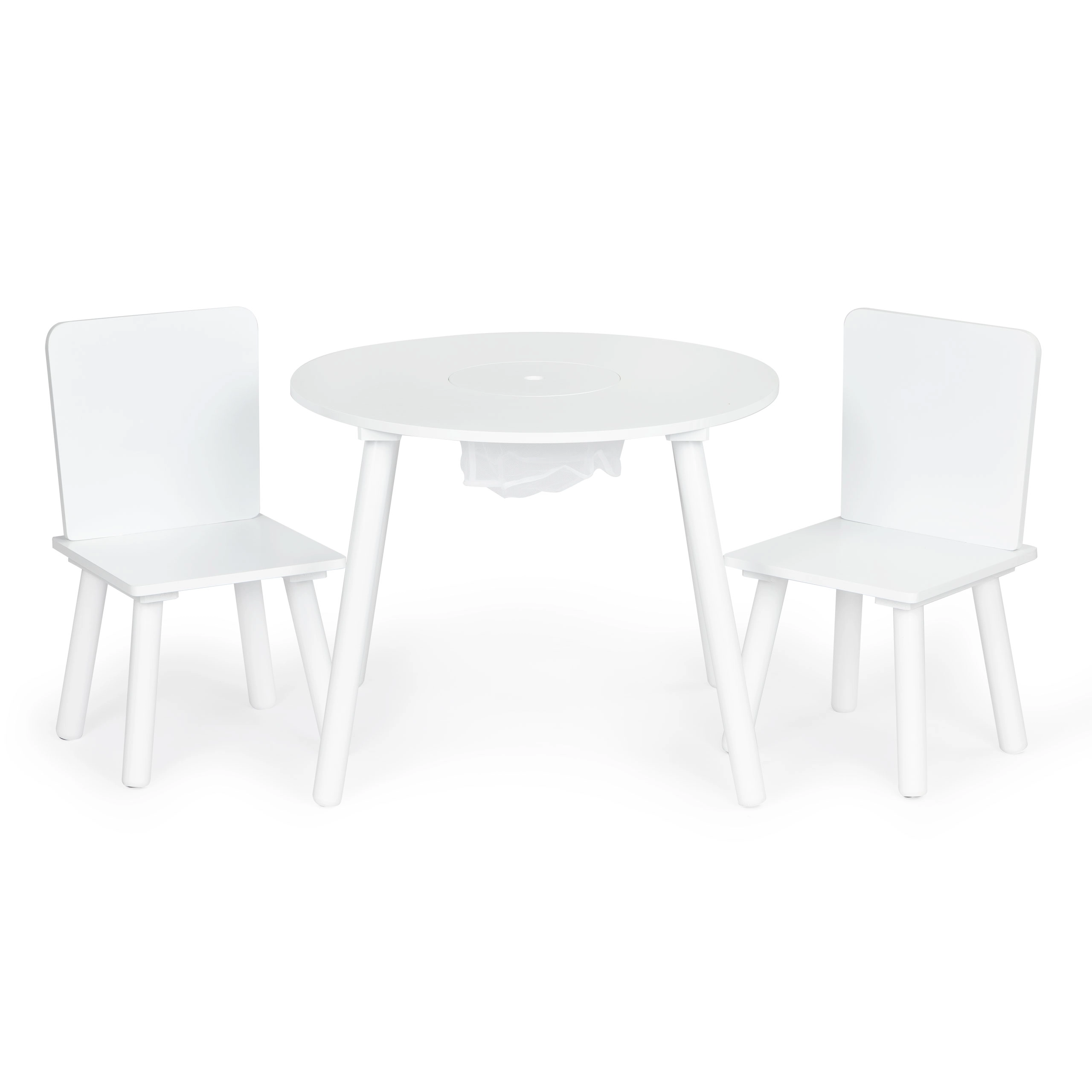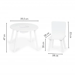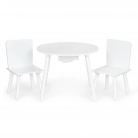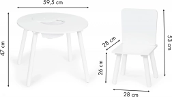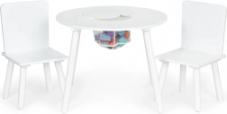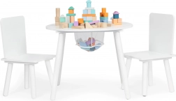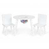 Set di mobili per bambini ECOTOYS, elegante e pratico, composto da un tavolino rotondo bianco e due seggioline. Offre gambe in pino massiccio, piano in MDF resistente e un intelligente vano portaoggetti a rete integrato sotto il coperchio per riordinare i giocattoli in un attimo. Ideale per studiare, giocare e mangiare in autonomia nella cameretta o nella stanza dei giochi.