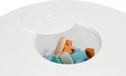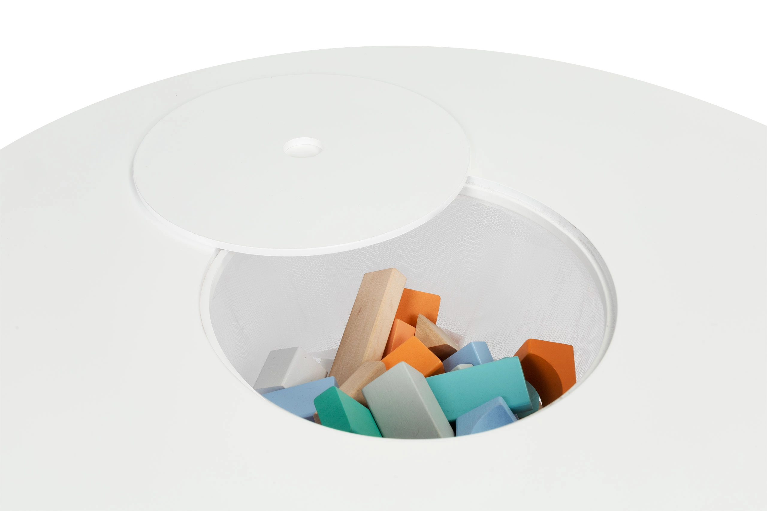 Il pratico coperchio ribaltabile al centro del piano nasconde un cestino in rete dove riporre in un attimo mattoncini, pastelli e piccoli giochi. Il set si integra perfettamente negli interni moderni dallo stile scandinavo ed è ideale per camerette, sale giochi e sale d’attesa.