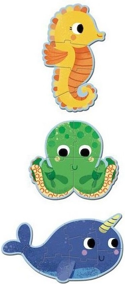 Puzzle sagomati per bambini con il tema di tre animali sottomarini: il cavalluccio marino, il polpo e il narvalo.