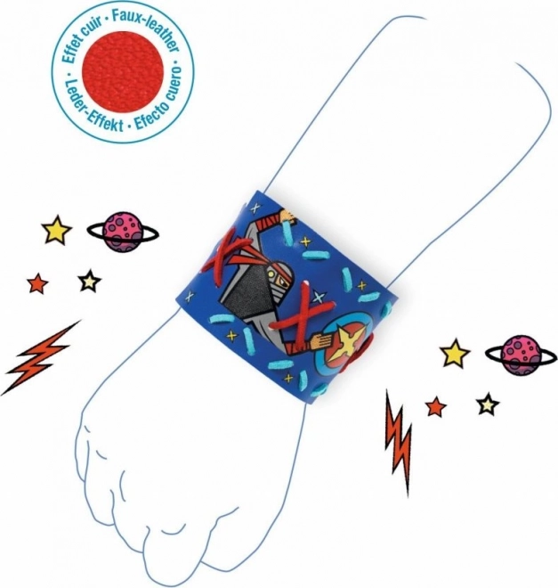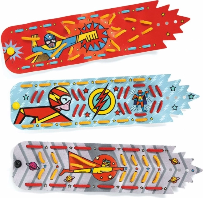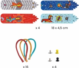 Con questo set creativo DJECO i bambini potranno progettare e realizzare fino a quattro braccialetti dal look supereroico. Grazie ai pezzi preforati la creazione è intuitiva e divertente: basta infilare i cordoncini seguendo i segni sui bracciali e le istruzioni allegate. Il comfort è garantito dai morbidi cordoncini in camoscio e dagli elementi in similpelle.