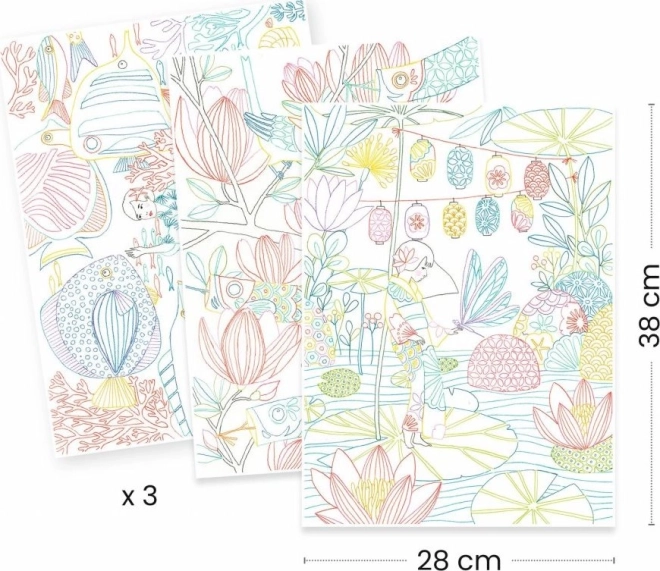 Il set include un portfolio con 3 grandi illustrazioni pronte da colorare. Ogni immagine offre approcci diversi con bordature colorate, sfondi chiari e scuri che forniscono idee eccezionali per la colorazione. Che tu scelga di seguire le palette e i modelli proposti dagli artisti o preferisca la tua strada, dipende solo da te. Le illustrazioni sono stampate su carta fine di qualità artistica, spessa e con una leggera grana.