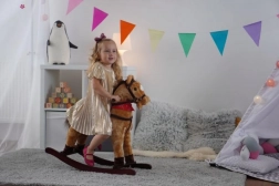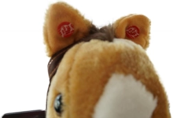 Questo cavallino a dondolo marrone è realizzato in peluche di alta qualità, morbido al tatto, che invita alle coccole e al gioco sicuro. La lavorazione realistica con briglia, sella e staffe stimola la fantasia dei bambini e trasforma ogni cameretta in un piccolo ranch.