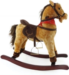 Il controllo interattivo è semplice: premi un'orecchia o l'altra e il cavallino emetterà il tipico nitrito o il trotto. Le robuste slitte in legno e le maniglie offrono sicurezza durante il dondolio, mentre il foulard rosso dona stile al giocattolo.