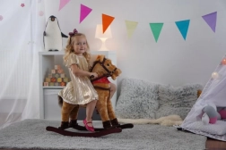 La sella dettagliata, le staffe e la briglia conferiscono al cavallino un aspetto autentico e al tempo stesso garantiscono una seduta comoda e stabile per il bambino.