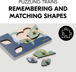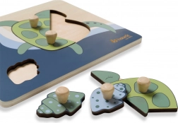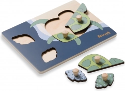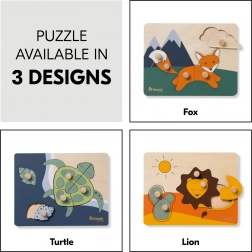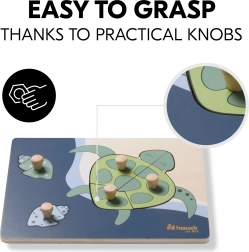 Il puzzle in legno con pomelli Turtle è progettato per le piccole mani dei bambini. Ogni pezzo ha un pomello in legno per una presa facile e un inserimento preciso. Componendo il puzzle, il bambino allena motricità fine, coordinazione occhio-mano, memoria e percezione di forme e colori. I bordi arrotondati garantiscono un gioco sicuro già dai 12 mesi.