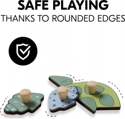 Ogni pezzo ha un pomello in legno che facilita ai bambini il sollevamento e l’inserimento preciso nel posto giusto – ideale per i principianti.