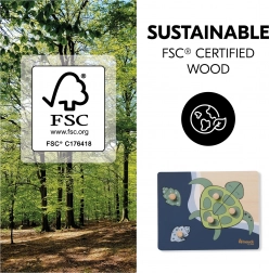 Il giocattolo è realizzato in legno certificato FSC, quindi è rispettoso dell’ambiente e resistente per il gioco quotidiano. La delicata palette di tonalità verdi e blu stimola la curiosità e al tempo stesso ha un effetto calmante.