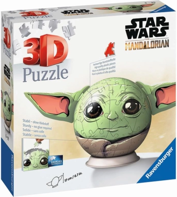 Scopri il divertimento intergalattico con il puzzle 3D Ravensburger STAR WARS Grogu – sfera da 72 pezzi. Ideale per bambini dai 6 anni. Grazie ai pezzi in plastica di alta qualità e al sistema a incastro preciso, creerai un modello 3D stabile senza colla. La confezione compatta è pratica sia per riporre che come regalo. Goditi una sfida divertente, la costruzione 3D e il motivo Grogu preferito.
