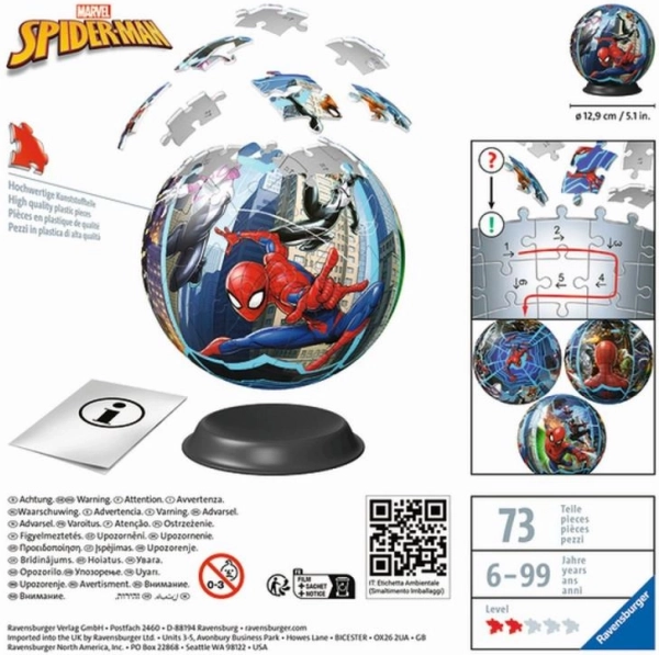Scopri il divertimento in 3D con la sfera puzzle Ravensburger con il motivo di SPIDERMAN. Grazie ai pezzi di plastica curvi si assembla facilmente, senza colla, e una volta completata crea una sfera solida e liscia dal diametro di 13 cm. Ideale come decorazione di stile e come divertimento per bambini e adulti.