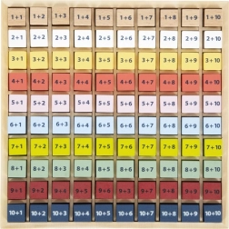 Ogni blocchetto contiene un semplice esercizio di addizione e, sul retro, la risposta corretta. I bambini possono così lavorare in autonomia, verificare i risultati e rafforzare la fiducia in sé in matematica. La tabella è realizzata in resistente legno 100% FSC®, ecologico e piacevole al tatto.