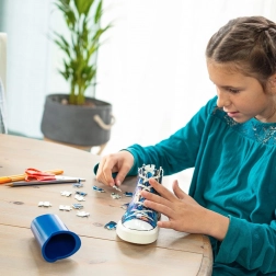 Durante il montaggio i bambini allenano pazienza, pensiero logico e motricità fine. La sneaker finita si trasforma in un portapenne per matite, pastelli e forbici, così la gioia del risultato dura ogni giorno.