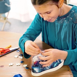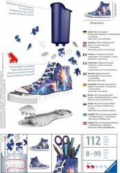 RAVENSBURGER 3D puzzle Sneaker Space unisce il divertimento creativo a un uso pratico. Grazie ai pezzi resistenti e perfettamente combacianti, i bambini possono costruire un modello stabile senza colla, che diventa un ornamento e un accessorio utile per la cameretta. Il design cosmico nei toni blu‑viola stimola l'immaginazione e l'entusiasmo per il mondo della scoperta.